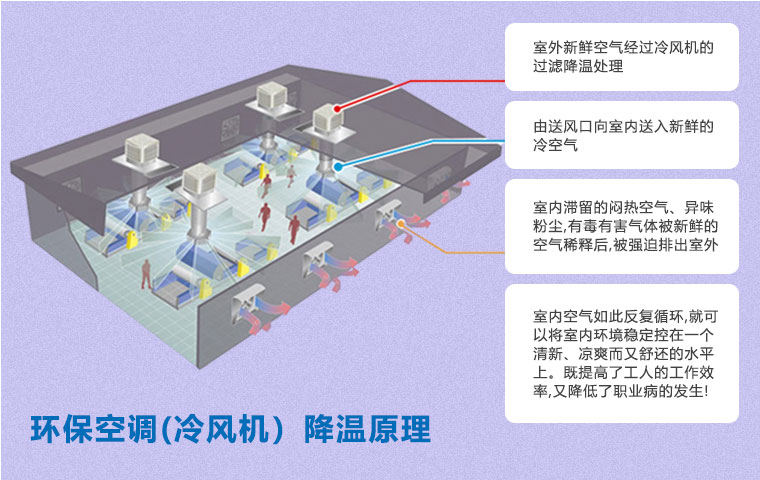 研究表明,舒適的工作環境可以提高生產力,有效的降低員工操作時的錯誤率,以及怠工情緒。環保空調(冷風機)可以在炎熱的天氣中提供有效的通風降溫解決方案,創造舒適良好的生產環境。